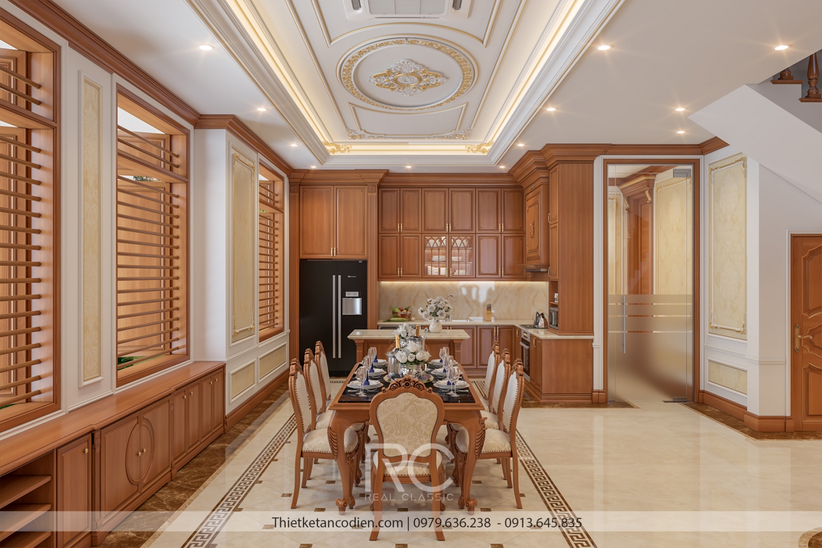 Tổng quan không gian bếp ăn hiện đại, sang trọng trong căn nhà phố Thanh Hoá mang phong cách tân cổ điển