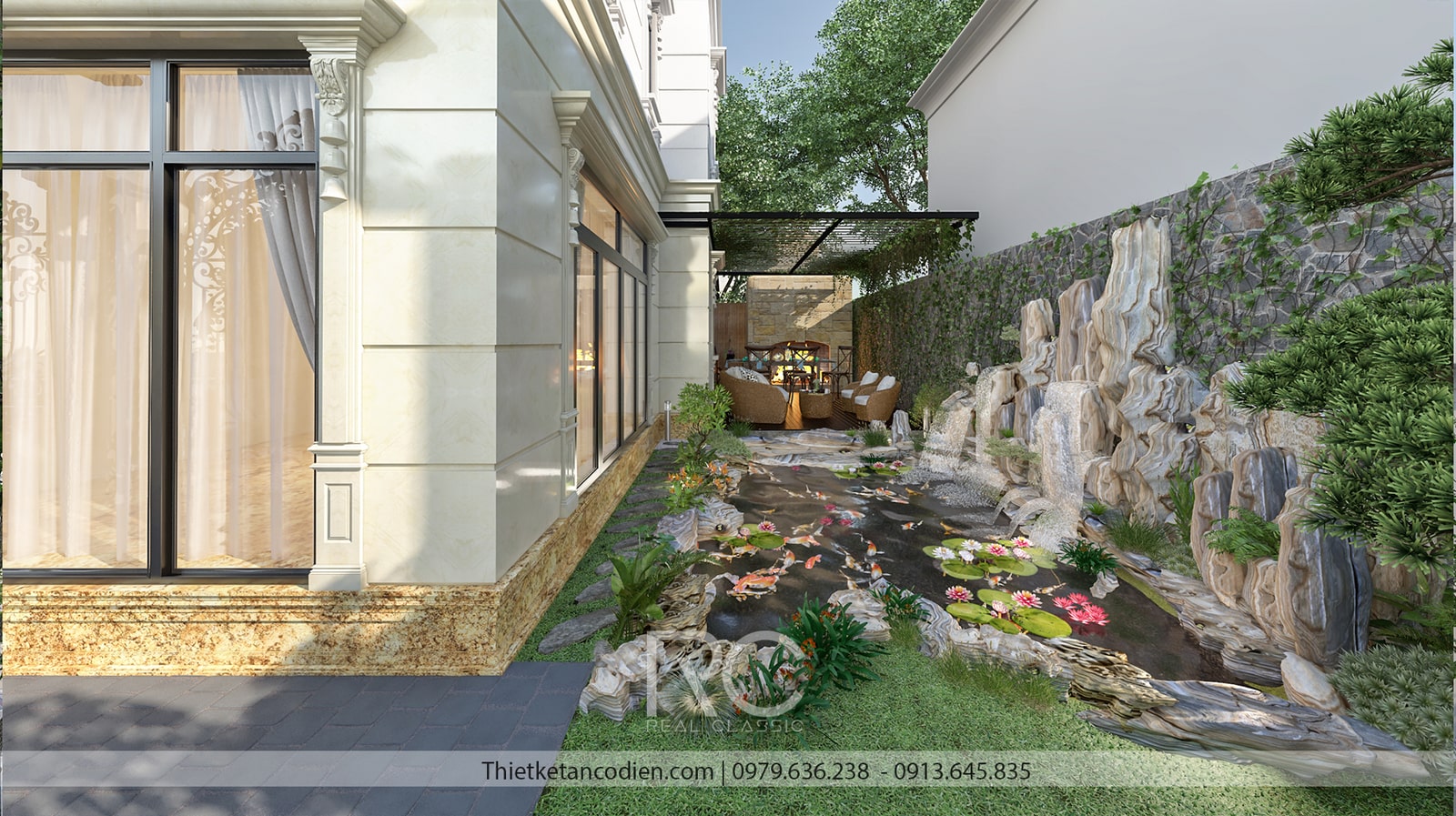 Cảnh quan sân vườn xung quanh của mẫu biệt thự 3 tầng tân cổ điển
