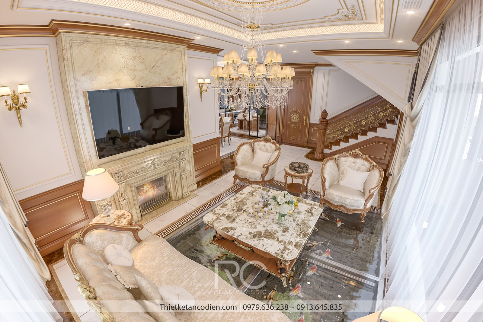 Mẫu biệt thự 3 tầng tân cổ điển Vinhomes Harmony với không gian phòng khách sang trọng và cầu kỳ
