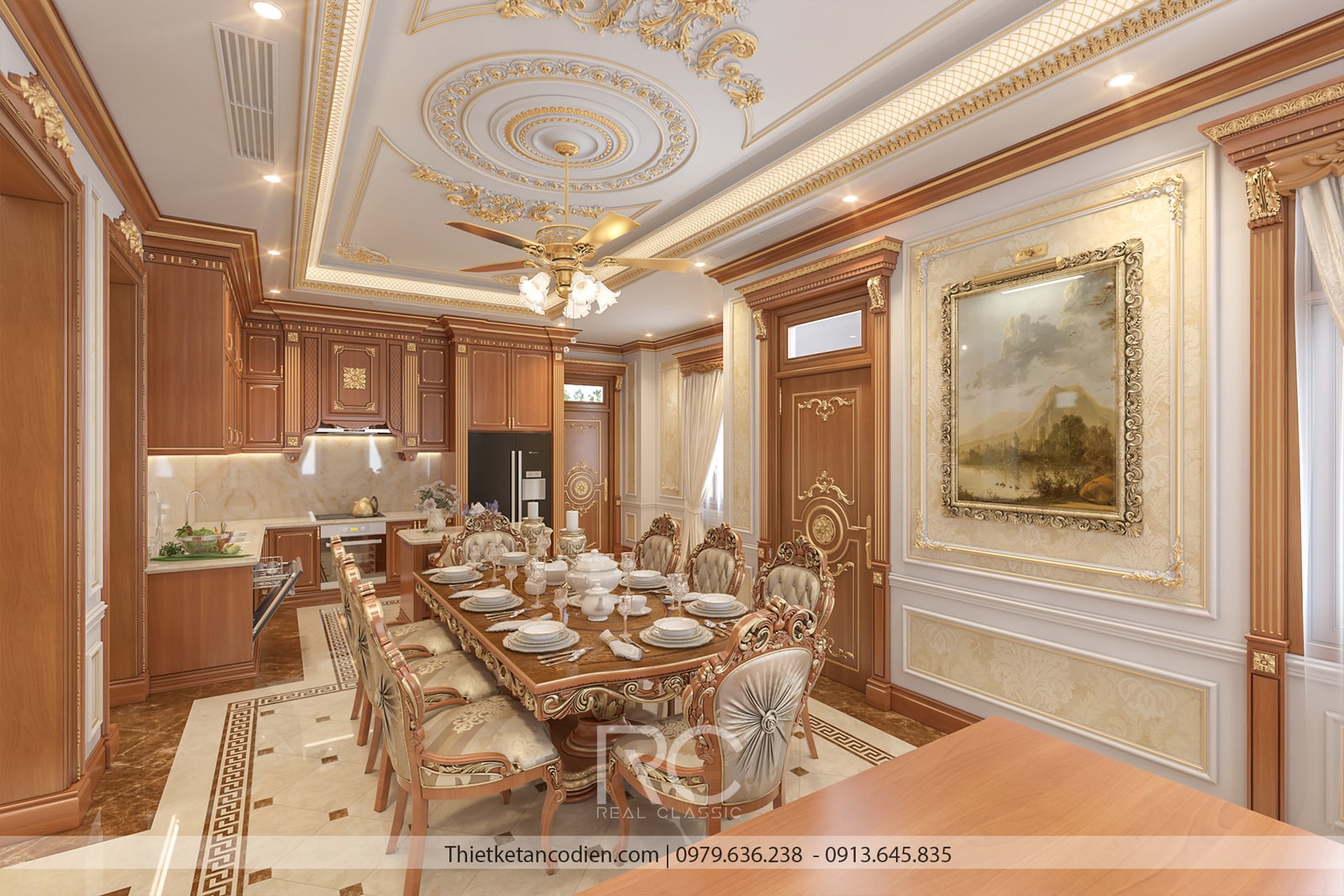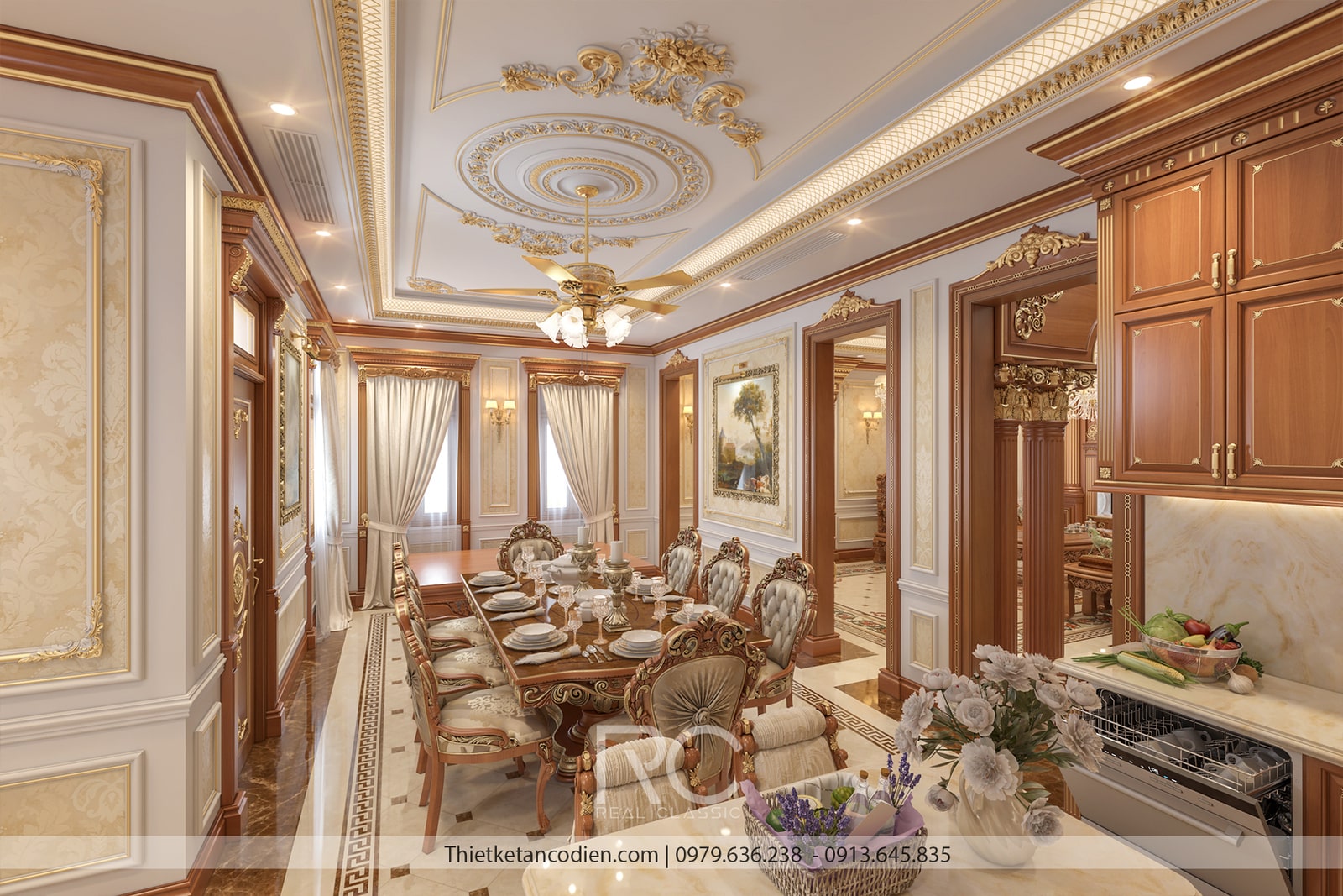 Phòng bếp và phòng ăn được thiết kế với sự cầu kỳ trong từng chi tiết, tạo nên không gian vừa tinh tế vừa tiện nghi, lý tưởng cho những bữa ăn gia đình ấm cúng và các buổi tiệc sang trọng. Phong cách chủ đạo là tân cổ điển, thể hiện qua sự kết hợp hài hòa giữa các vật liệu cao cấp và họa tiết trang trí.