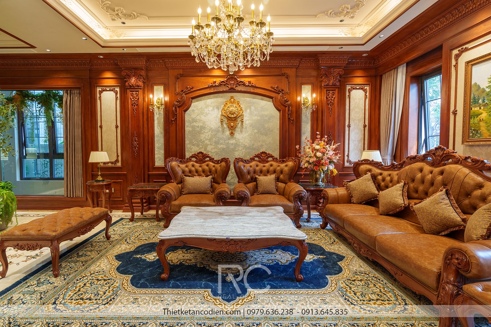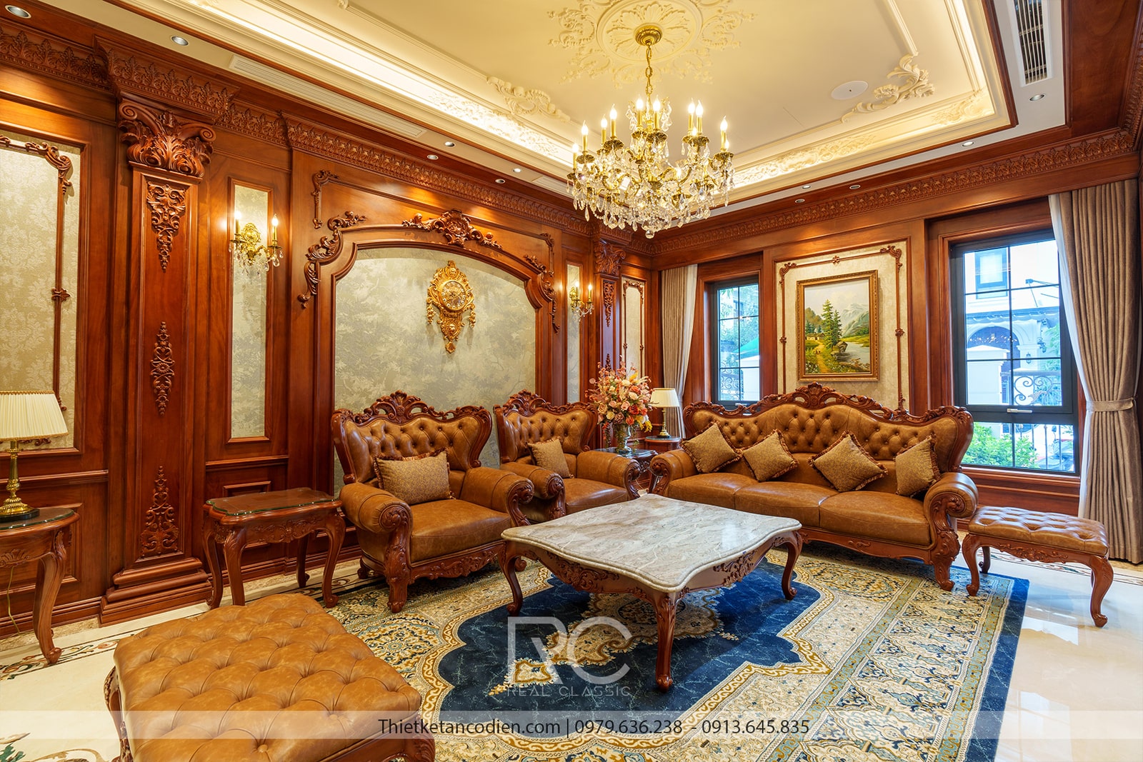 Phòng khách là không gian được đầu tư nhiều nhất với bộ sofa da cao cấp màu nâu sẫm, kết hợp cùng bàn trà mặt đá sang trọng. Các chi tiết trang trí như đèn chùm pha lê, tranh nghệ thuật, … được chọn lựa cẩn thận, phù hợp với phong cách tân cổ điển. Trần nhà được trang trí bằng các phào chỉ tinh xảo, kết hợp với hệ thống đèn LED âm trần tạo hiệu ứng ánh sáng lung linh, làm nổi bật không gian.