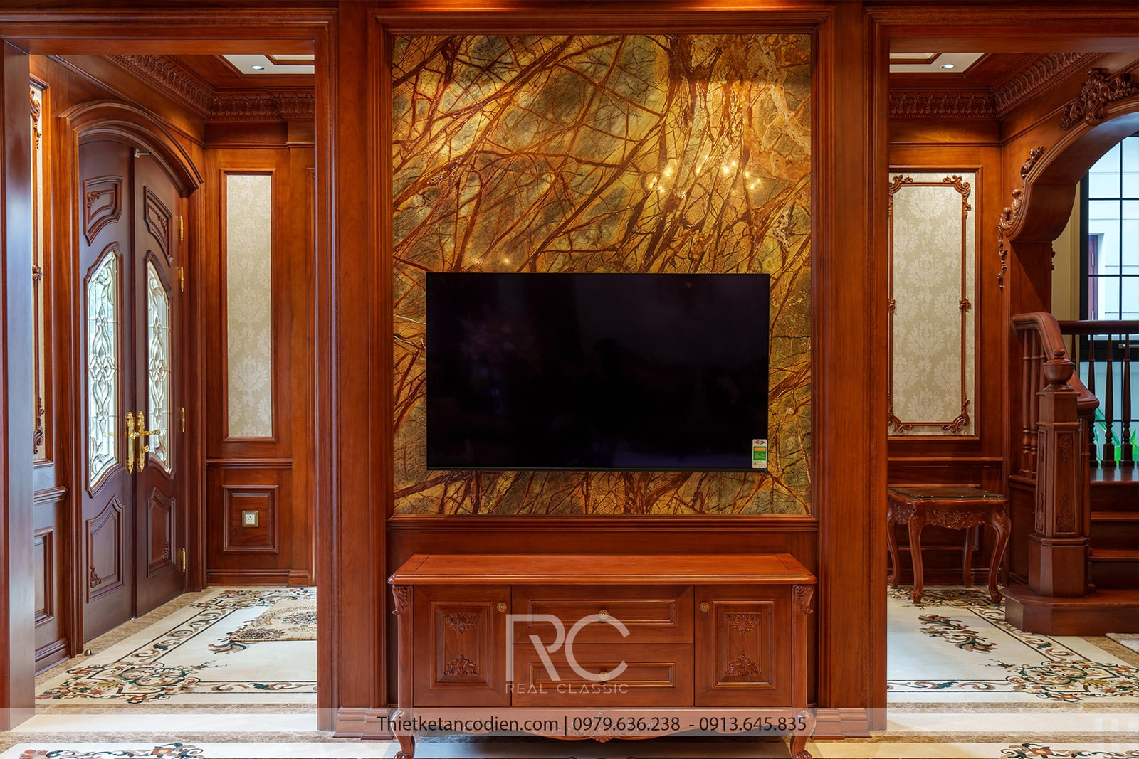 Kệ tivi và toàn bộ phòng đều được ốp bằng gỗ tự nhiên vô cùng sang trọng