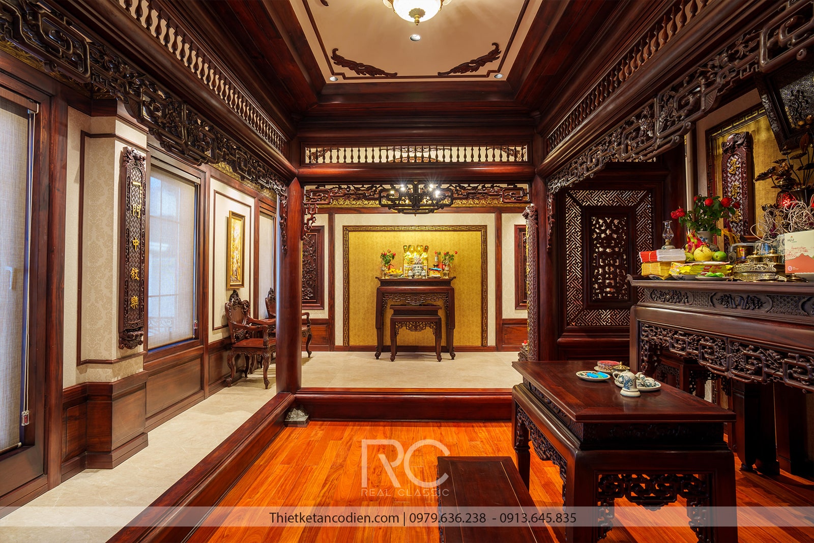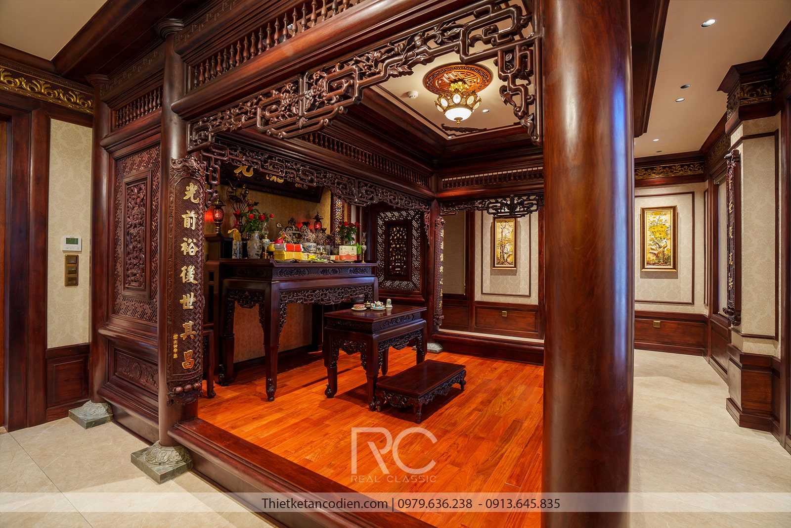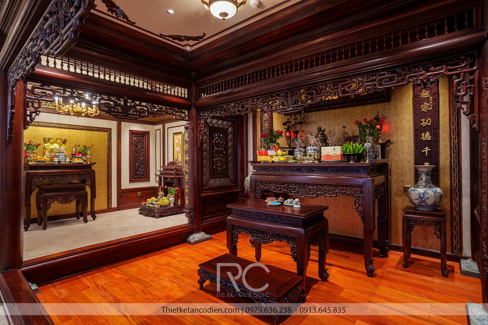 Phòng thờ là không gian mang tính chất tôn nghiêm, được bố trí ở vị trí cao nhất của biệt thự. Nội thất phòng thờ sử dụng gỗ tự nhiên với các hoa văn chạm khắc tinh tế, mang lại sự trang nghiêm và tôn kính. Đèn thờ và các vật phẩm thờ cúng đều được lựa chọn kỹ lưỡng, phù hợp với phong thủy và truyền thống của gia chủ.