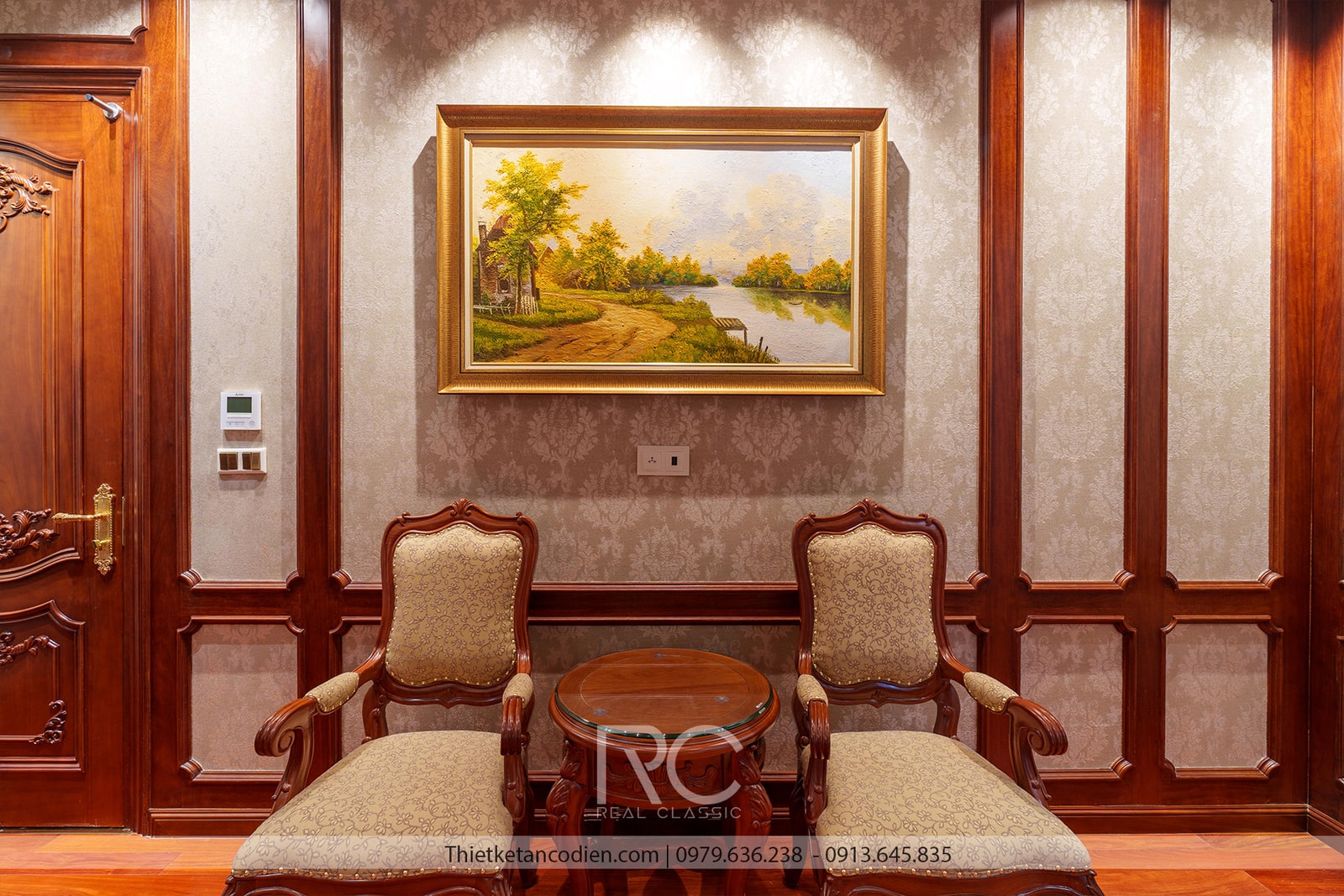Không gian sảnh chờ cũng được trang trí bằng tranh và ốp tường gỗ cầu kỳ