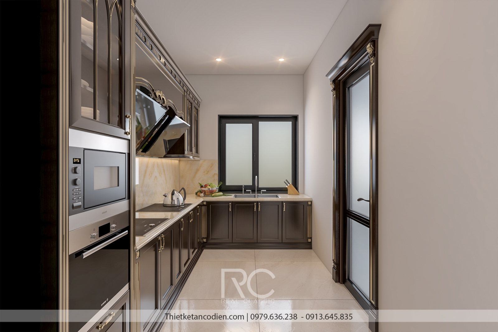 Biệt lập với không gian ăn uống chính là phòng bếp. Với thiết kế này, việc nấu nướng của gia chủ sẽ diễn ra thật kín đáo, mùi chế biến thức ăn sẽ không ám vào toàn bộ không gian nhà ở. Phòng bếp được thiết kế đơn giản, hiện đại nhưng đầy đủ công năng. Hệ thống tủ bếp chữ I, bàn đá nấu ăn, tủ khô trữ đồ ,… được thiết kế đơn giản,sắp xếp khoa học. Tất cả đều hoà hợp, tạo nên một không gian bếp núc ấm cúng, đậm chất tân cổ điển.