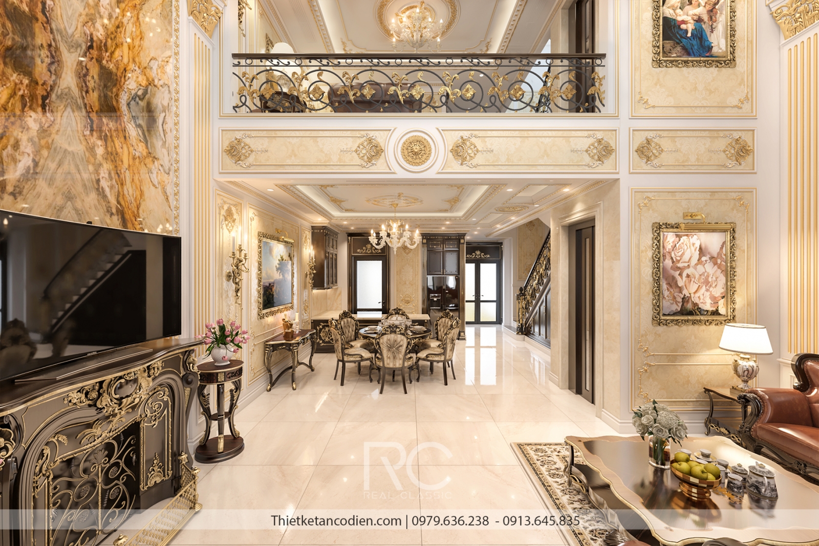 Bước chân vào không gian khách, chắc hẳn quý độc giả sẽ bị choáng ngợp bởi không gian sang trọng, xa hoa, thể hiện được gu thẩm mỹ vô cùng tinh tế của gia chủ.