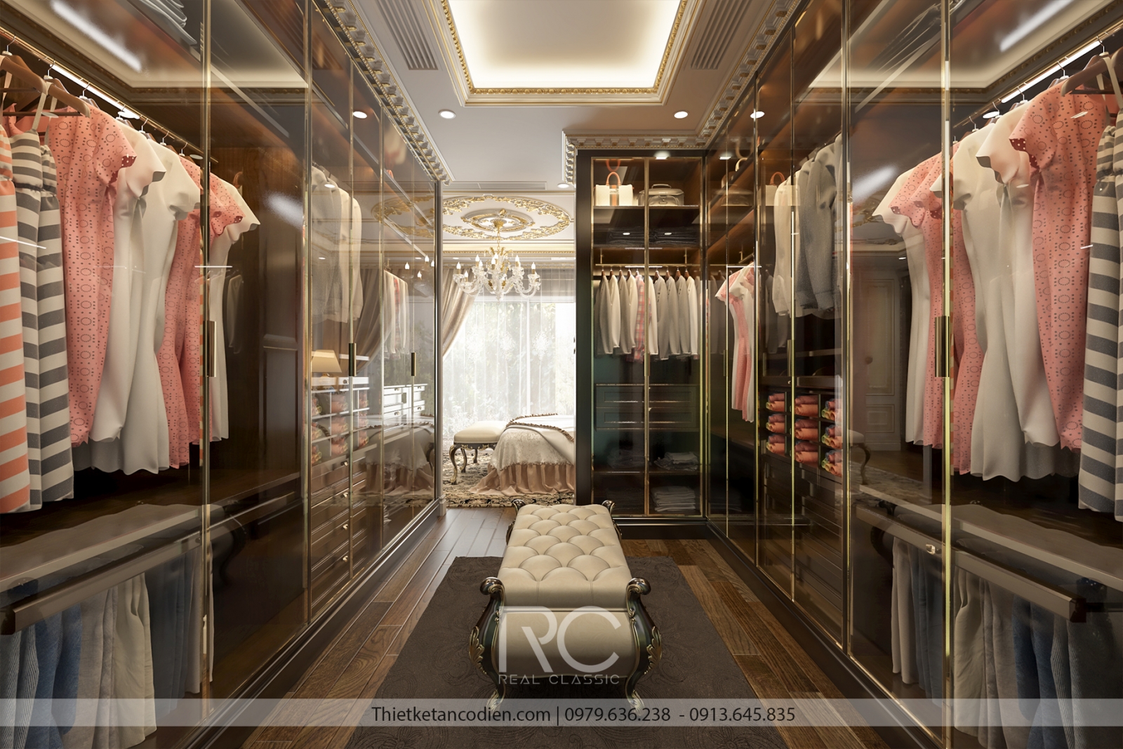Hệ thống tủ quần áo với kính trong suốt mang đậm phong cách tân cổ điển cho phòng thử đồ