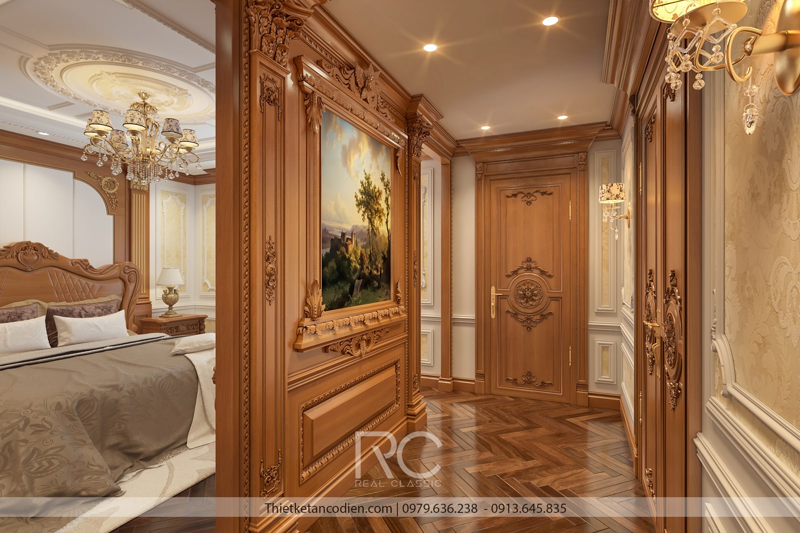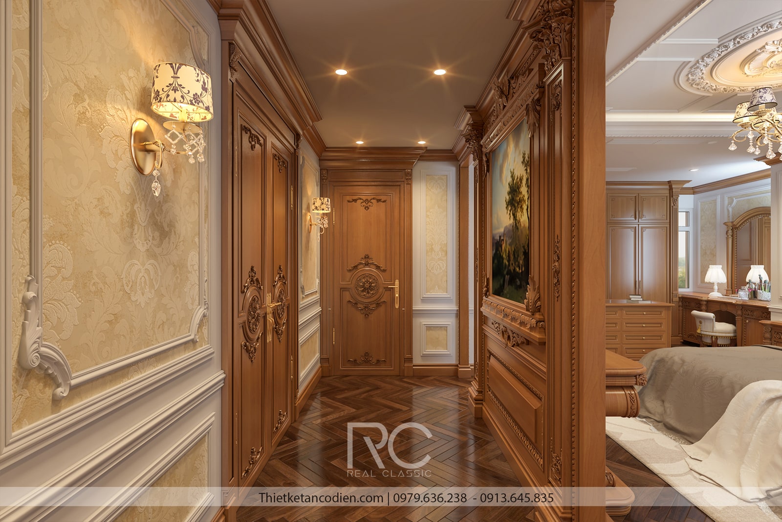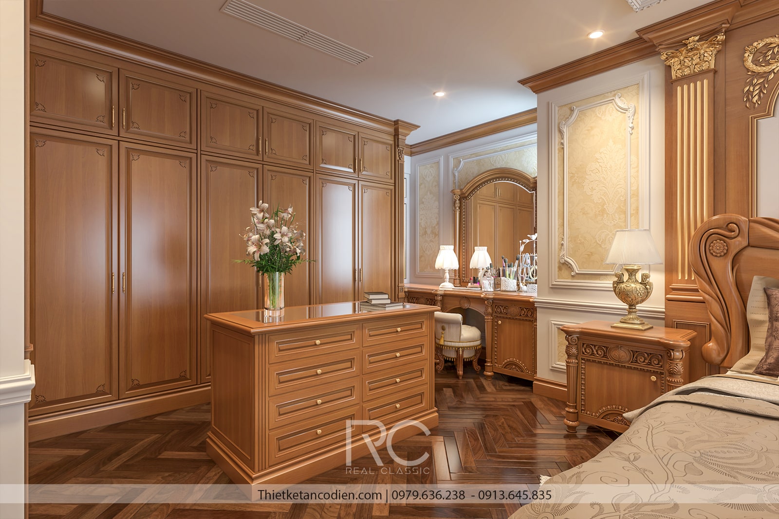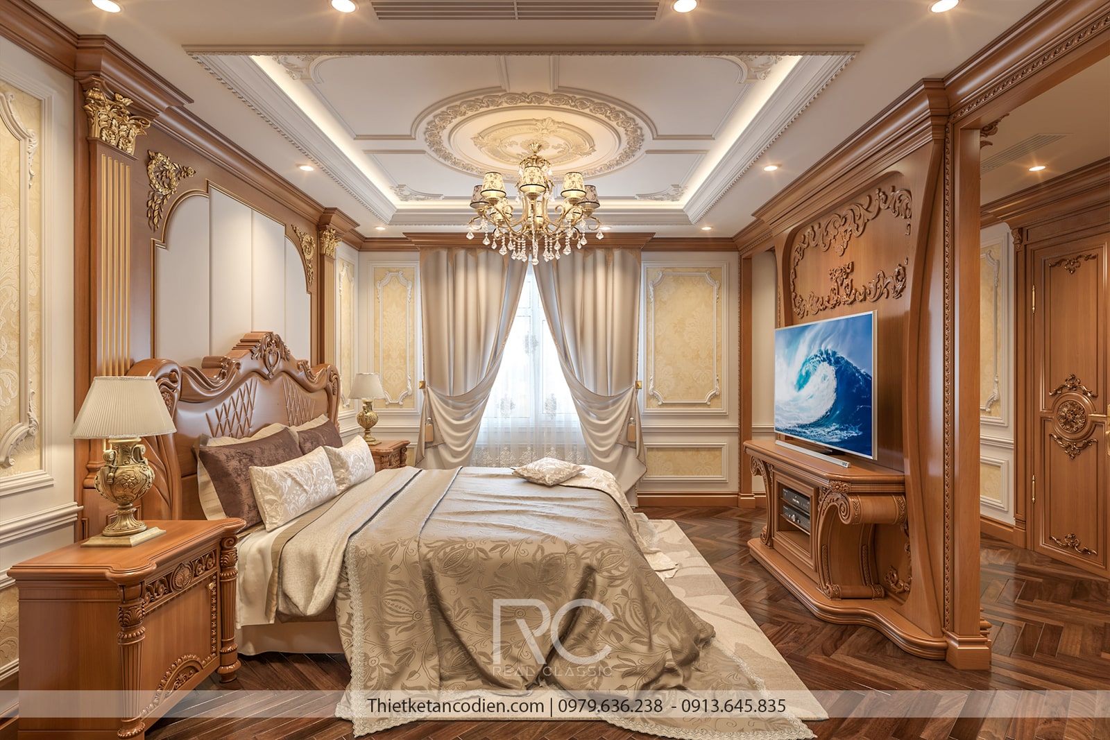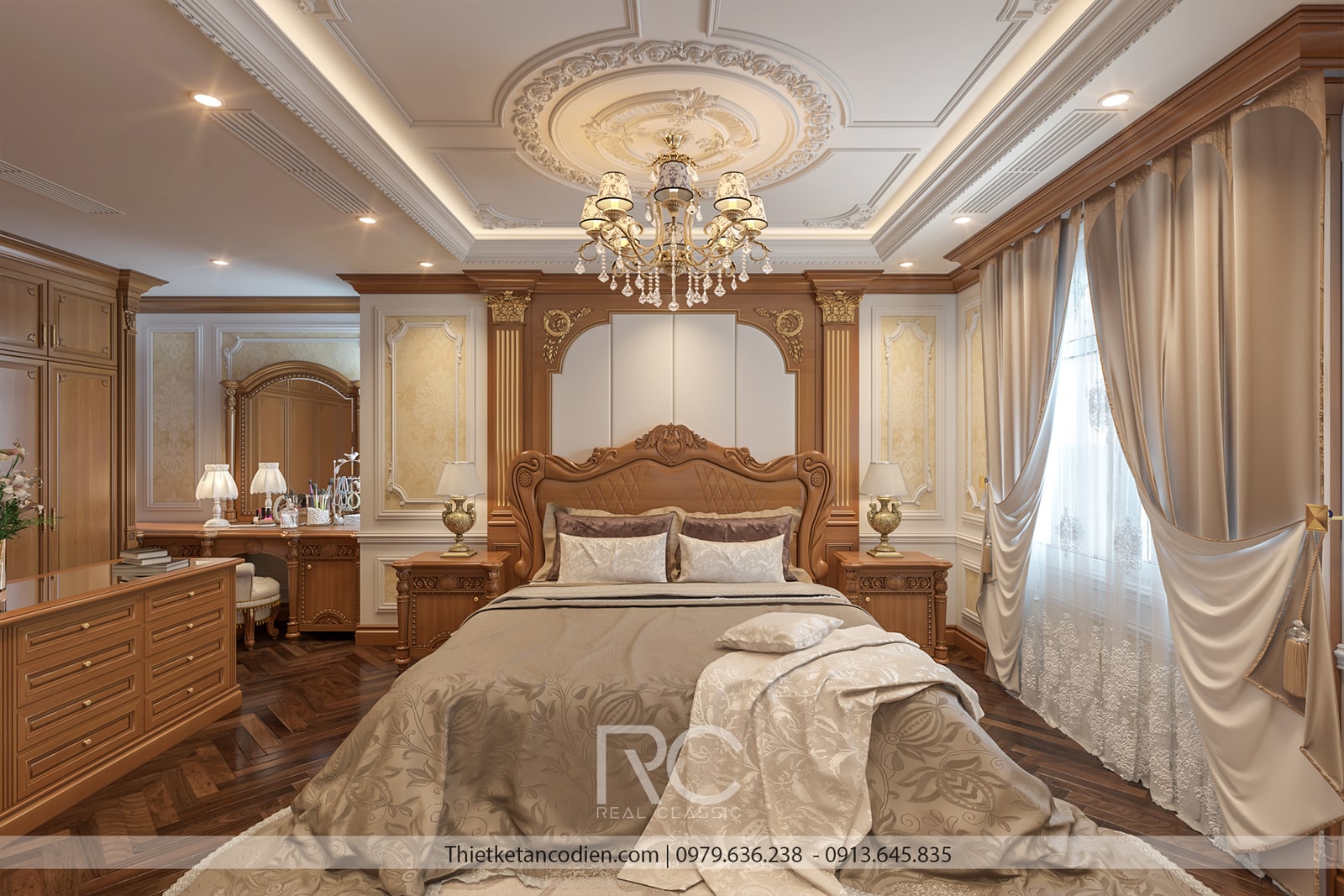 Giường ngủ là điểm nhấn chính của căn phòng, với khung giường lớn được chạm khắc tinh xảo, bọc da hoặc vải nhung cao cấp, mang lại cảm giác êm ái và thoải mái. Đầu giường thường có các họa tiết hoa văn tân cổ điển nổi bật, tạo cảm giác bề thế và quyền quý. Hệ thống tủ quần áo, bàn trang điểm, và tủ đầu giường đều được làm từ gỗ tự nhiên, kết hợp với các đường phào chỉ mềm mại, đồng bộ với tổng thể thiết kế.