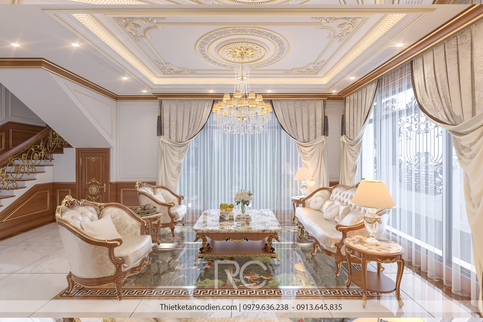 Mẫu biệt thự 3 tầng tân cổ điển Vinhomes Harmony với không gian phòng khách sang trọng và cầu kỳ